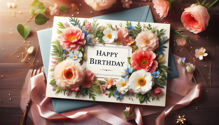 A charming birthday card adorned with a ribbon lays on a table, surrounded by delicate pink blossoms and a warm cup of coffee, creating a festive atmosphere for the occasion.