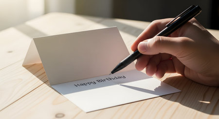 A close-up of a hand holding a black pen and writing 'Happy Birthday' in cursive on a white greeting card. The wooden table background and natural lighting highlight the personal and thoughtful nature of the message.