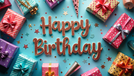 A vibrant arrangement of beautifully wrapped gifts in various colors surrounds a sparkling Happy Birthday sign, creating a joyful atmosphere. This delightful scene captures the essence of celebration, inviting everyone to join in the fun and festivities of a special day.
