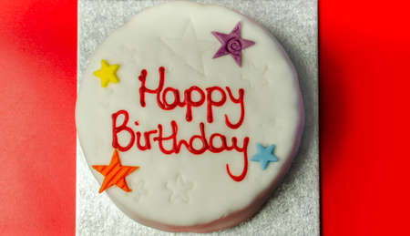 Happy Birthday Cake, Sponge cake layered with a sweet frosting and raspberry jam, decorated with soft icing decorations, celebration