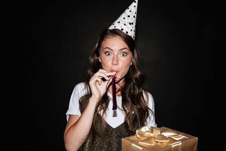 Image of nice excited woman in party cone blowing pipe and holding gift box isolated over black wall