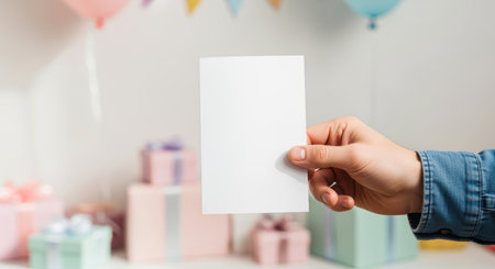 Hand holding blank white card against blurred festive background with pastel wrapped gifts and colorful balloons for celebration.