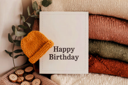 A minimalist birthday card rests on a stack of cozy, autumn-toned knitted sweaters, accompanied by a small yellow knitted hat and eucalyptus sprigs.
