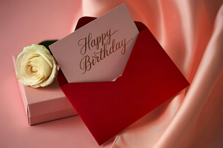 A red envelope containing a delicate birthday card rests on a pink silk fabric, accompanied by a single white rose and a pink gift box.