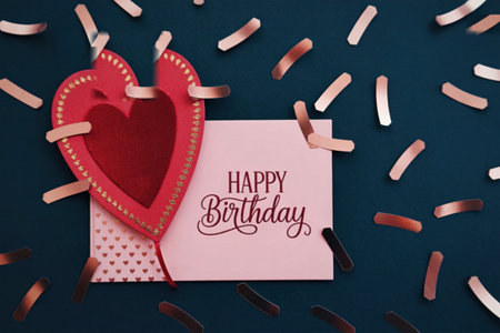 A pink birthday card with elegant calligraphy and a layered red heart design, surrounded by rose gold confetti on a dark teal background.