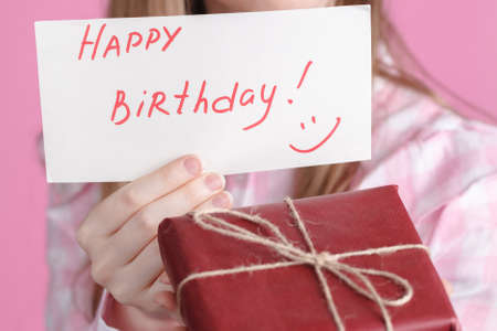 A woman holds a paper with the inscription Happy birthday in front of her.