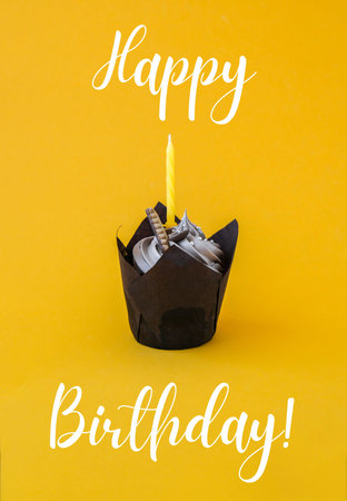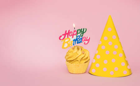 Happy birthday text greeting card. Birthday cupcake with candle. Holiday. Celebration background.