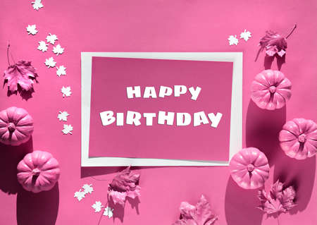 Text Happy Birthday in frame. Pink fuchsia paper background with Autumn decor.