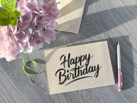 Happy Birthday Card with Pink Flowers and Pen on Gray Wooden Table