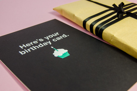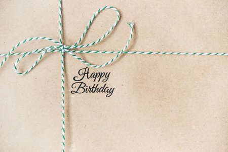 A handmade gift in brown wrapping paper and with black ribbon. A present with a postcard for birthday close up view. Texture background of a holiday preparations.