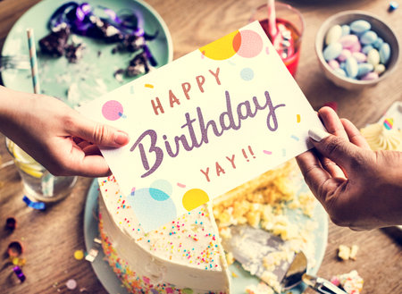 A hand holds a white card featuring a hand drawn cake icon and the word birthday against a vivid yellow backdrop, conveying warmth, joy, and festive celebration. Generated A.I.