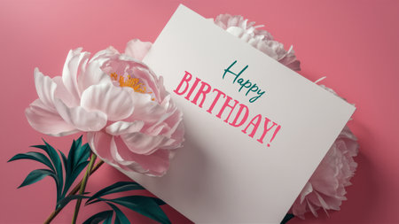 Elegant birthday card featuring pink peonies on a vibrant pink background with happy birthday! text in stylish fonts, perfect for celebration and greeting designs.