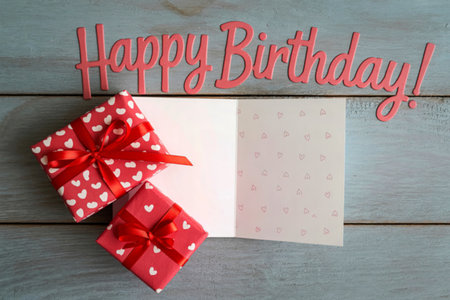 Two festive gift boxes with red ribbons sit beside an open birthday card on a weathered wooden surface.
