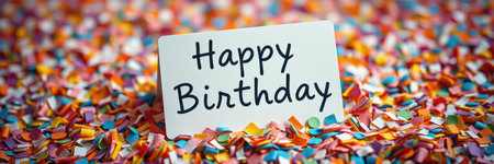 Brightly colored confetti surrounds a card that expresses warm birthday wishes on a celebratory occasion