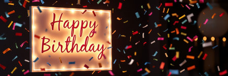 Colorful birthday celebration with bright sign and confetti filling the air during evening festivities