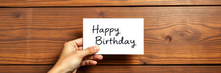 Hand holding a birthday card with a handwritten message in front of a wooden background