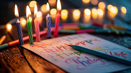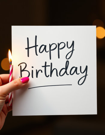 Celebratory birthday greeting held by hand with a candle illuminating the festive message during a joyful occasion