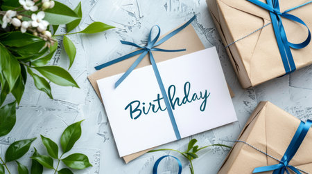 Greeting card lying on a gray background surrounded by gift boxes and green leaves, celebrating a birthday