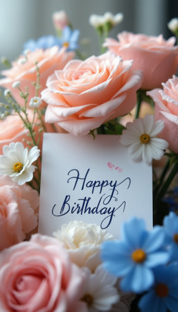 A stunning arrangement of soft pink roses and delicate daisies surrounds a charming birthday card that reads Happy Birthday in elegant script. The vibrant colors and gentle textures create a warm, inviting atmosphere, perfect for celebrating a special day filled with love and joy.