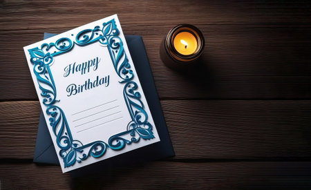 Happy birthday card for a man on a dark wood background with a burning candle and a greeting sheet, copy space, flat lay.
