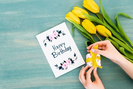 cropped view of woman holding gift box near greeting card with happy birthday lettering and yellow tulips on blue wooden surface
