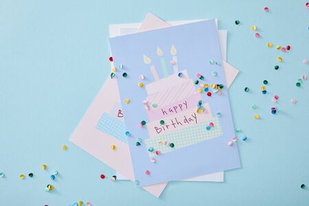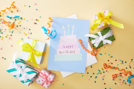 top view of festive colorful confetti, gifts and happy birthday greeting card on beige background