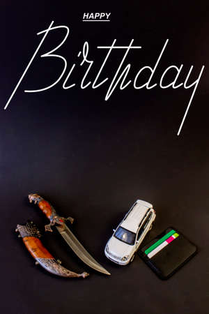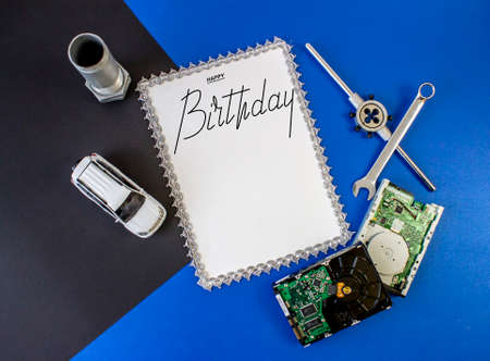 postcard, Internet banner, flat lay with a birthday greeting, with the inscription - happy birthday. For men or boy.