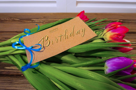 Tulip bouquet in craft paper on wooden table, message happy birhday