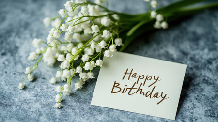 A close-up shows a soft ivory birthday card with gold lettering, adorned with lilies of the valley on a gentle gray background.