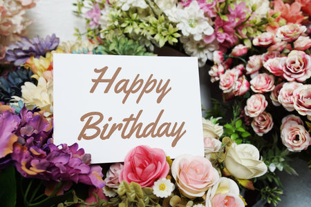 Happy Birthday text message on paper card with beautiful flowers decoration