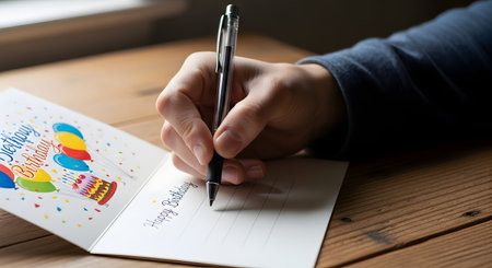 A close-up view of a person's hand using a pen to write a birthday wish inside a greeting card featuring colorful balloons. The scene captures the act of preparing a thoughtful handwritten message on a wooden table.