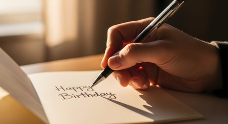 A close-up of a hand using a pen to write 'Happy Birthday' in elegant script on a greeting card. The scene is bathed in warm sunlight, evoking a personal, thoughtful, and celebratory sentiment.