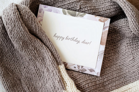 A simple happy birthday card rests on a cozy, taupe-colored knitted sweater with cream accents. The card features a delicate floral design.