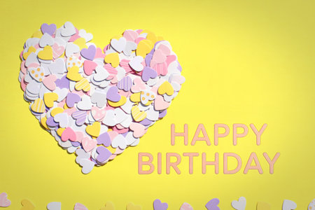 A large heart shape made of pastel-colored confetti sits on a bright yellow background next to the words Happy Birthday in pink lettering.