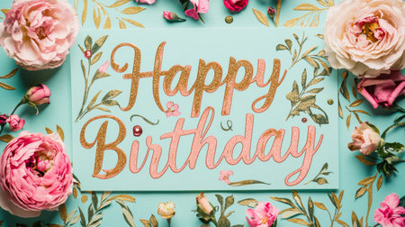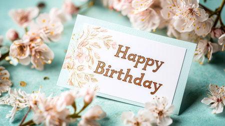 The birthday card, beautifully crafted with elegant lettering, sits amidst soft blossoms. The pastel turquoise background enhances the cheerful celebration vibe, inviting heartfelt wishes.