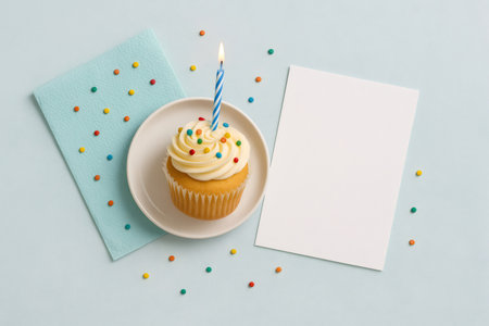 Single cupcake with lit candle and blank greeting card on light blue background is ready for birthday celebration