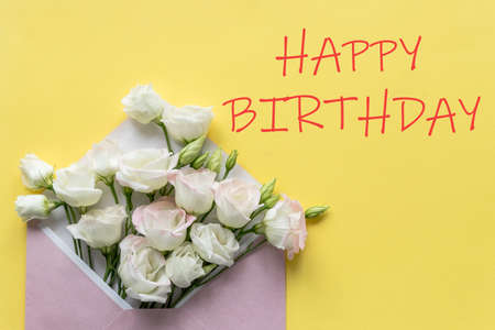 Stylish Birthday greeting card design. Text Happy Birthday on yellow background.White eustoma flowers is in envelope. Trendy flat lay.