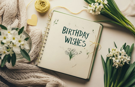 A cozy scene featuring a notebook with birthday wishes, flowers, heart, and string