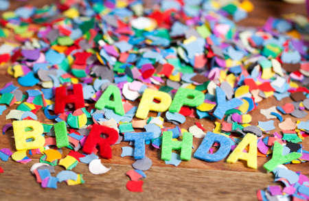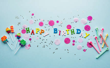Text Happy Birthday by wooden letters with candles and confetti on blue background