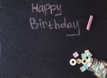 Birthday party. White wooden table with a delicious cake next to a colorful happy birthday sign surrounded by sprinkles