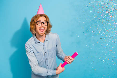 Photo of sweet shocked young guy dressed jeans shirt eyewear headwear shooting confetti isolated blue color background