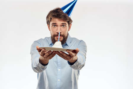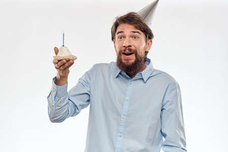 Cheerful man with a cap on his head with a patty holiday decoration birthday