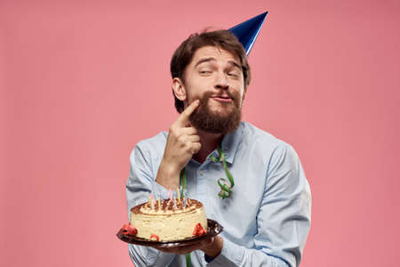Man with cake in a plate and in a blue shirt on a pink background birthday holidays cropped view