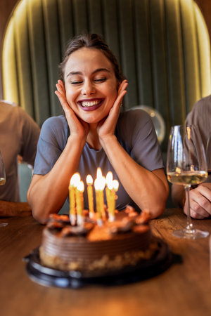 Birthday girl smiles as she blows out candles on her cake in a restaurant, surrounded by friends, gifts, and festive decorations.