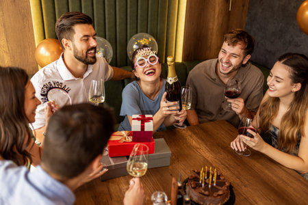 Group of smiling friends toasting a glass of champagne while celebrating birthday at bar