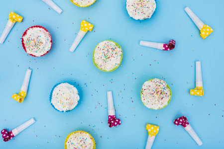 Holiday cupcake background with place for text. Top view. Happy birthday concept.