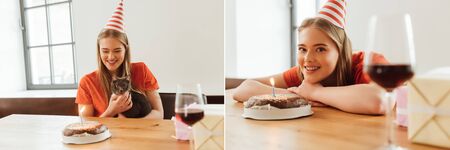 collage of happy girl with cat near birthday cakes, wine glasses and presents