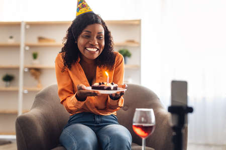 African Female Holding Birthday Cake Near Phone Celebating Online Indoor
