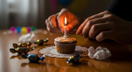 A close-up shot of hands carefully placing a lit birthday candle onto a frosted cupcake. Scattered colorful candies and crumpled wrappers surround the cupcake on a wooden table, creating a festive yet intimate celebration moment.