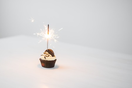 Food and holiday concept - Birthday cupcake with sparkler over white background with copy space
